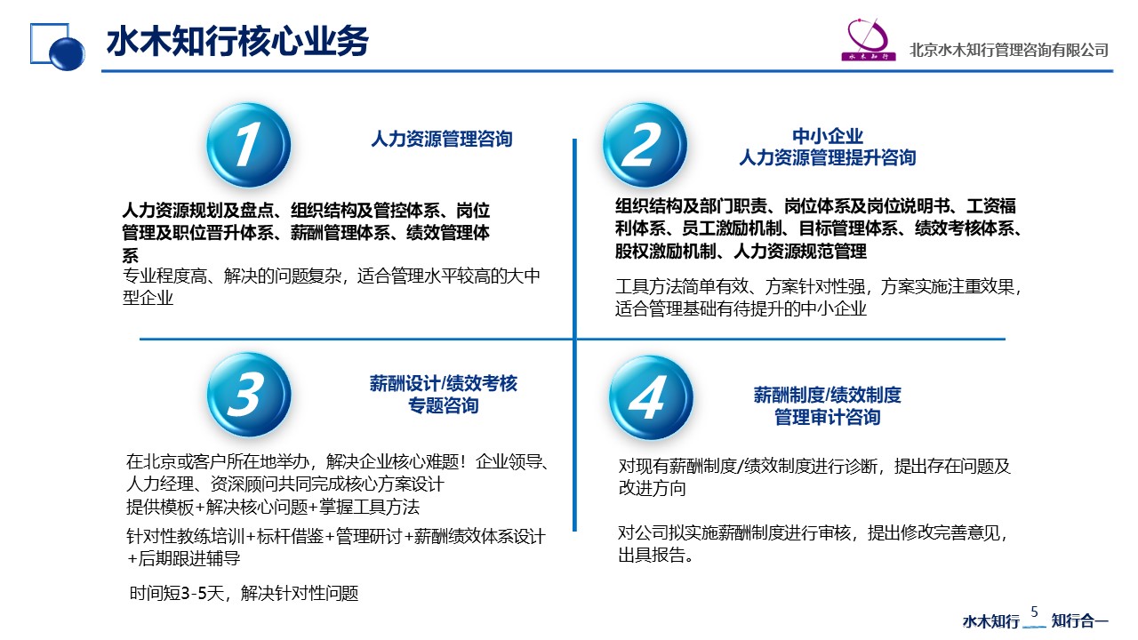 北京水木知行管理咨詢有限公司(www.bjsmzx_com.runxingsoft.com)專注提供人力資源管理咨詢、人力資源管理培訓、人力資源招聘咨詢、人力資源獵頭服務業務;咨詢業務范圍包括組織結構與管控體系、崗位管理體系、薪酬管理體系、績效管理體系,咨詢形式包括全過程咨詢、教練式咨詢和特訓班;培訓業務包括企業基礎管理...[詳情]